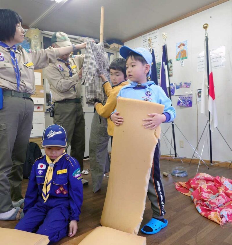 かかし作りの材料として、リーダーの私物である服や靴、帽子が用意され、竹馬作りで余った竹を使って骨格を作りました。骨格の中に入れるのは約5センチのマットレスでしたが、小さなスカウトには少し大きく扱いづらかったため、リーダーが手を貸しながら作業を進めました。服やズボンにスポンジを詰めて人の形に整えるのは苦労しましたが、みんなで協力して完成度を高めました。
