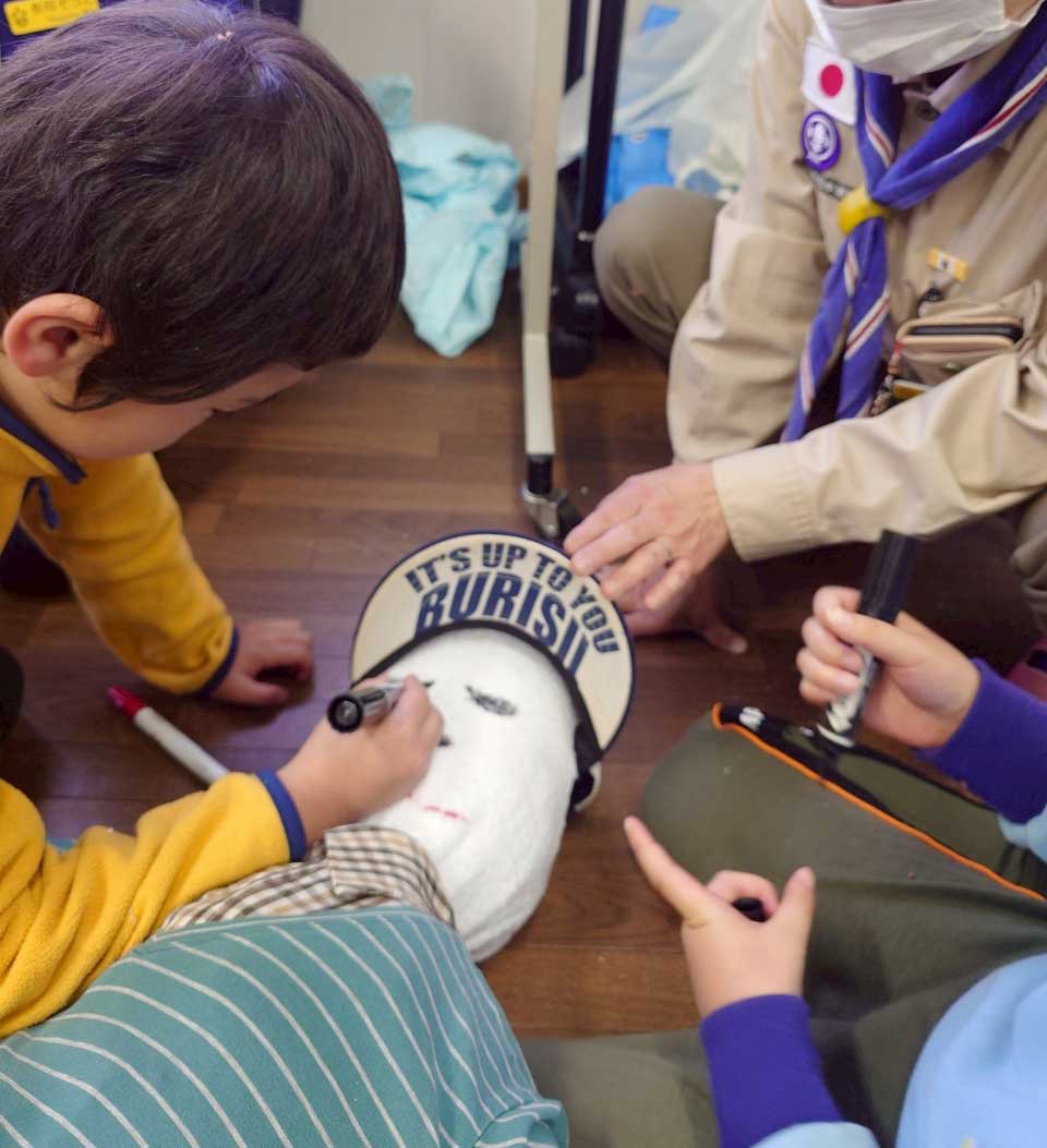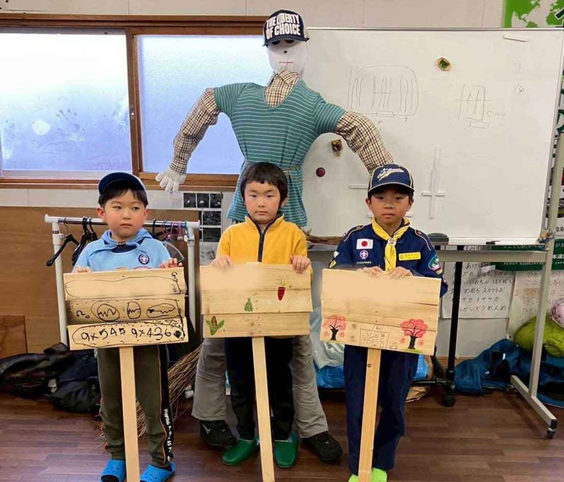 手には手袋をはめて形を整え、マジックで顔を描き入れていきました。こうして完成したのは、大きくて迫力のあるかかしです。完成後は、ボーイ隊が前もって作成してくれた畑のプレートに、自分たちで名前や絵を書き込んで設置。かかしと一緒に記念撮影も行い、思い出の一コマとなりました。
