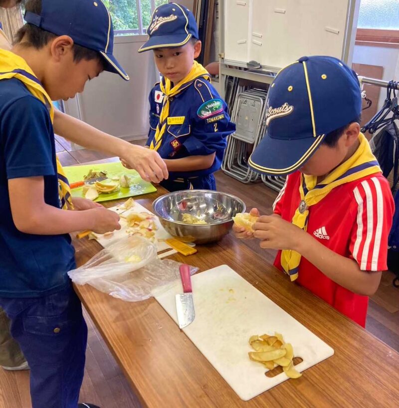 自分たちで開ける、切る、火をおこす、煮るという一連の流れを経験することで、子どもたちは調理の楽しさと達成感を味わいました。出来上がったフルーツポンチは、斬新な発想とみんなの協力で好評となり、ボーイ隊にも分けてあげるなど、みんなで喜びを共有しました。