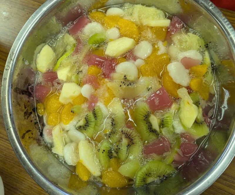 お湯が沸くと、丸めた団子を入れて煮ました。団子が煮えたら冷水で冷やし、ざるに取って水切りをします。最後に、ハウスで作った果物と団子を混ぜ合わせると、とてもおいしいフルーツポンチの完成です。