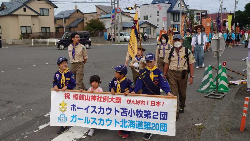 樽前山神社の例大祭は毎年7月14日から16日までの3日間にわたり開催され、16日の最終日には盛大な神輿の渡御が行われます。 この神輿の渡御の先導を務めるのがボーイスカウト苫小牧第2団のスカウトたちです。 スカウトの後ろには、天狗を先頭に袴を身に着けた行列が続き、その後お稚児さんの列も連なり、多くの参加者による大きな行列となります。 このため、交差点を渡る際には大変な混雑となり、交通整理員や警察官が安全確保のため信号を止めて交通整理を行います。