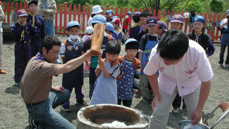 ボーイスカウト苫小牧第2団は率先して「餅つき披露」を担当しました。スカウトたちは伝統的な杵と臼を用い、力を合わせて餅をつきあげる様子を参拝者や祭りの訪問者に披露しました。その出来たての餅は無料でふるまわれ、多くの方々に喜んでいただきました。この餅つき体験を通じて、スカウトたちは協力の大切さや地域の伝統文化への理解を深めることができました。