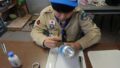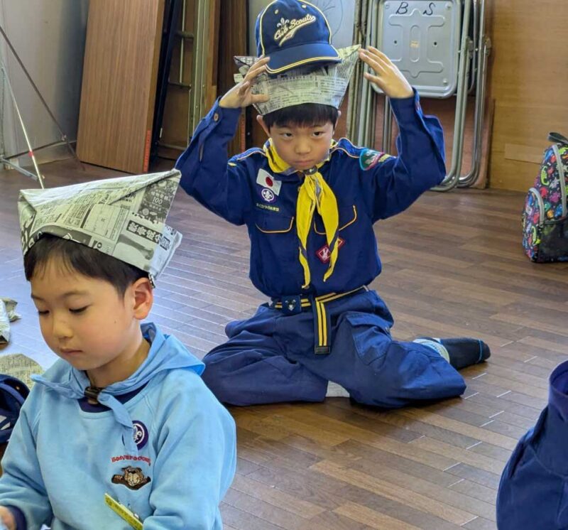 次に実技として、スカウトたちは身の回りにあるもので自分の体を守る工夫に挑戦しました。紙を使って即席の兜(カブト)を折り、頭を守る方法を実践。また、地震の際はガラスの破片などで足元が危険になることがあるため、元気よく紙で靴も作って履いてみました。小さな手で工夫しながら真剣に作り、みんなで兜と靴姿になった時には楽しそうな笑顔も見られました。