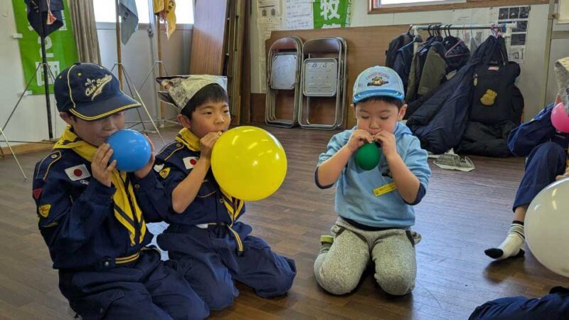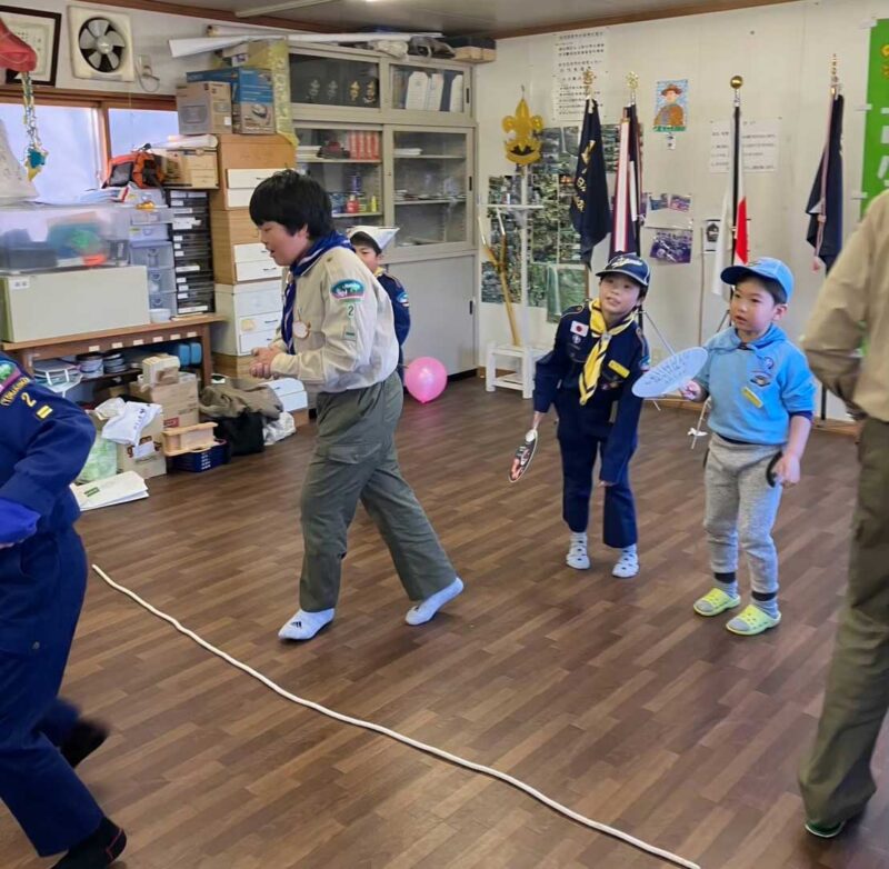 活動の後半は、体を動かすレクリエーションとしてボーイ隊も合流し、風船とうちわを使ったバレーボール大会を開催しました。ネットの代わりに床にロープを張り、ふわふわ浮かぶ風船をみんなで一生懸命に追いかけました。スカウト同士が声をかけ合い、協力してプレーするなかで、災害時にも大切な「助け合い」の心も自然に育まれていました。