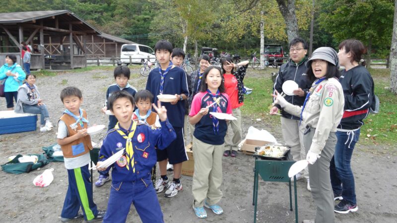 モーラップキャンプ場では、すでにお母さんたちが先に食材の買い出しを終え、炭火をたく準備を進めていました。香ばしいジンギスカンのにおいが漂い、イカ焼きの煙も立ち上ります。スカウトたちは手に手に持ってきたおにぎりをほおばり、山の新鮮な空気とともに豊かな食事の時間を満喫しました。笑い声が弾み、食事中の会話は途切れることなく、自然の中での楽しいひとときが続きます。