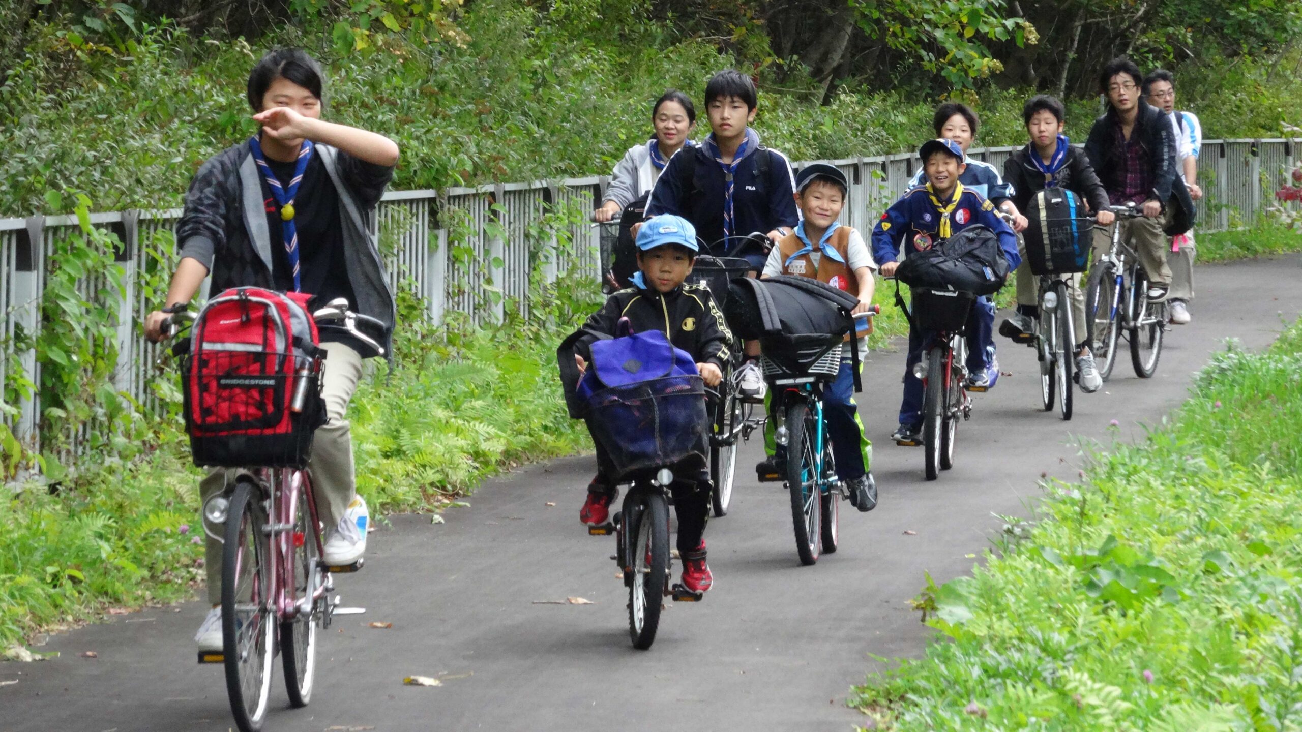 2014年9月の清々しい朝、ボーイスカウト苫小牧第2団の26人のスカウトと父兄たちが、朝9時にサイクリングターミナルに元気に集合しました。リーダーからの注意事項が丁寧に伝えられ、スカウトたちは二つの班に分かれました。班ごとにパンク修理担当や救急担当を決め、互いに助け合う体制を整えて、いよいよサイクリングのスタートです。