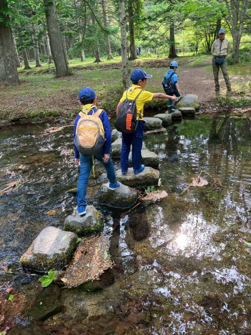 まず、小川にかかる飛び石を慎重に渡り、さらに奥にある木の橋を渡って探索を進めました。自然豊かな環境でしたが、なかなか動物を見つけることはできませんでした。しかし、木の上を飛び交う多くの鳥の姿を見ることができ、その名前はわからなかったものの、子どもたちの好奇心を刺激しました。
