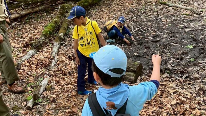 2025年の新緑が輝く晴れた日に、ビーバースカウトとカブスカウトが北海道大学研究林へ動物探しに出かけました。参加した子どもたちは自然の中での冒険を楽しみに、元気いっぱいに集いました。