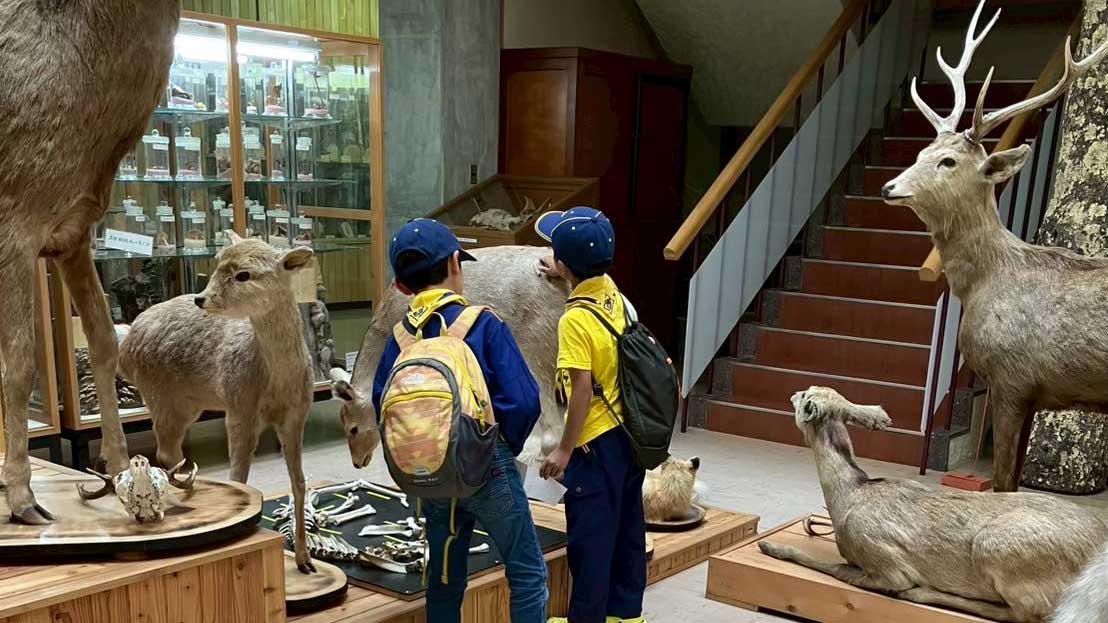 偶然、普段は閉まっている森林資料館が開いていたため、みんなで見学することに。館内にはクマやシカのはく製がずらりと並び、木の標本や昆虫標本も数多く展示されていました。特に狐の襟巻はスカウトたちの人気を集め、首に巻いて楽しむ姿が印象的でした。
