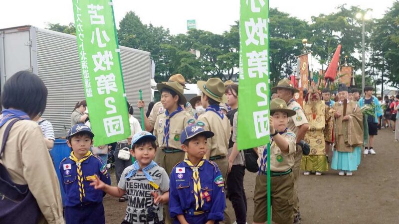 2025年7月16日、恒例の樽前山神社例大祭の渡御が例年の鉄北エリアから中央公園へと会場を移し、新たな形で行われました。私たちボーイスカウトは、この重要な祭りの一翼を担い、伝統の継承と地域との結びつきを深める奉仕活動に参加しました。