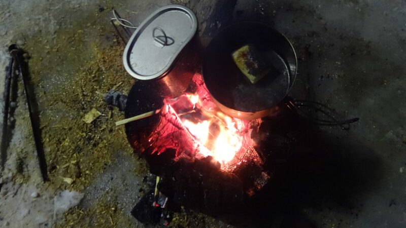 また、ドラム缶を半分に切り、吸気口を加工して薪を大量に燃やす特製の暖房設備も設置しました。これをタープの中に置くことでしっかりと暖かさを確保し、夜を快適に過ごすことができました。リーダーたちもその中で火の暖かさを楽しみつつ、スカウトたちの安全を見守りました。