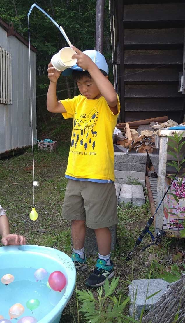 釣竿が完成した後は、外に用意された赤ちゃん用のバスタブに水をホースでたっぷり入れ、その中に水風船を浮かべて釣りを楽しみました。軽い水風船はすぐに釣れて、スカウトは大喜び。しかし、重い水風船はストローで作った釣竿が大きく曲がってしまい、なかなか釣れないので試行錯誤しながらチャレンジしていました。釣りに熱中する姿はとても真剣で、一つひとつの成功に笑顔がはじけていました。