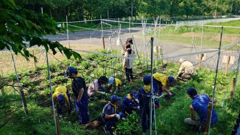 楽しい釣りの時間が終わると、カブ隊の仲間と一緒にスカウト菜園の草取り作業を行いました。みんなで協力して雑草を抜き、野菜や植物が元気に育つための準備を整えました。自然と接しながらの共同作業はスカウトたちの連帯感を高め、チームワークの大切さも実感できる貴重な時間となりました。