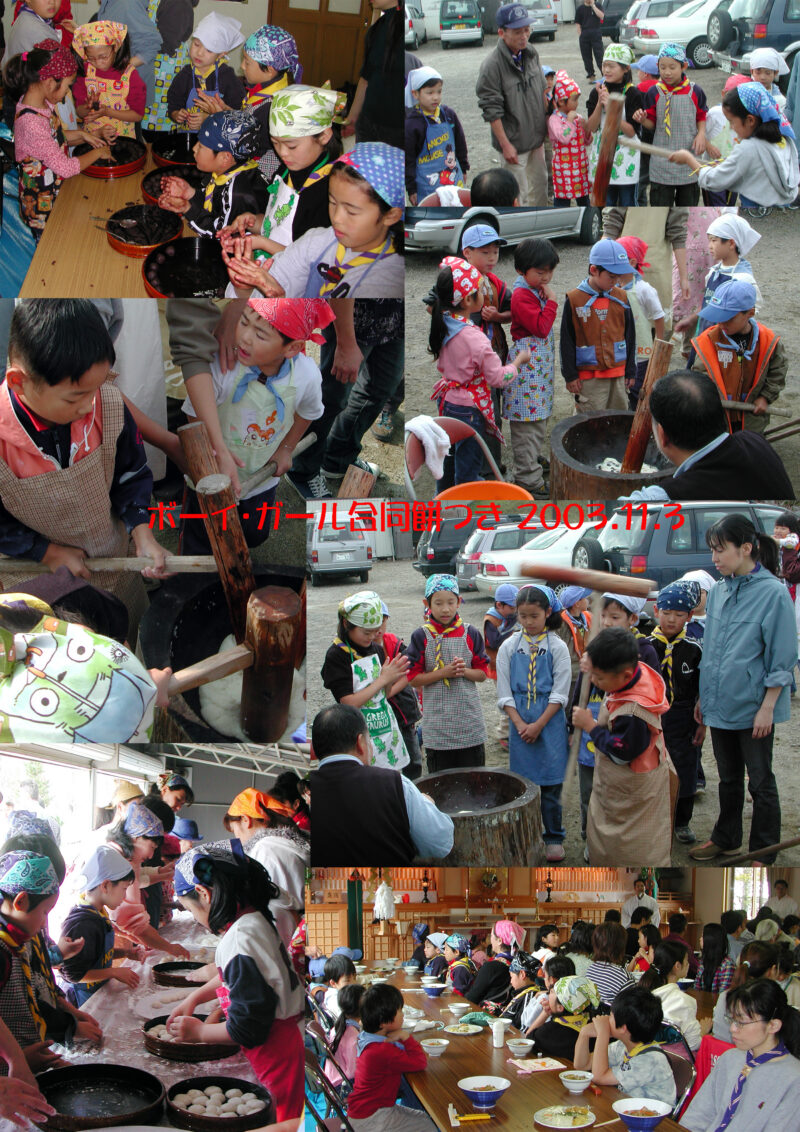 臼と杵で力いっぱい餅つき。つきたてのお餅は雑煮にして味わいました。日本の伝統行事を通じて、スカウトたちは文化を学び、リーダーや仲間と協力する楽しさを経験しました。
