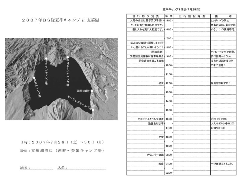 2007年7月28日から30日まで、苫小牧第2団のボーイスカウト隊は、北海道の美しい自然に囲まれた支笏湖周辺で夏季キャンプを行いました。 今回のキャンプは、徒歩での移動を伴う2泊3日の過酷な移動キャンプであり、総距離は約32キロメートルにも及びました。