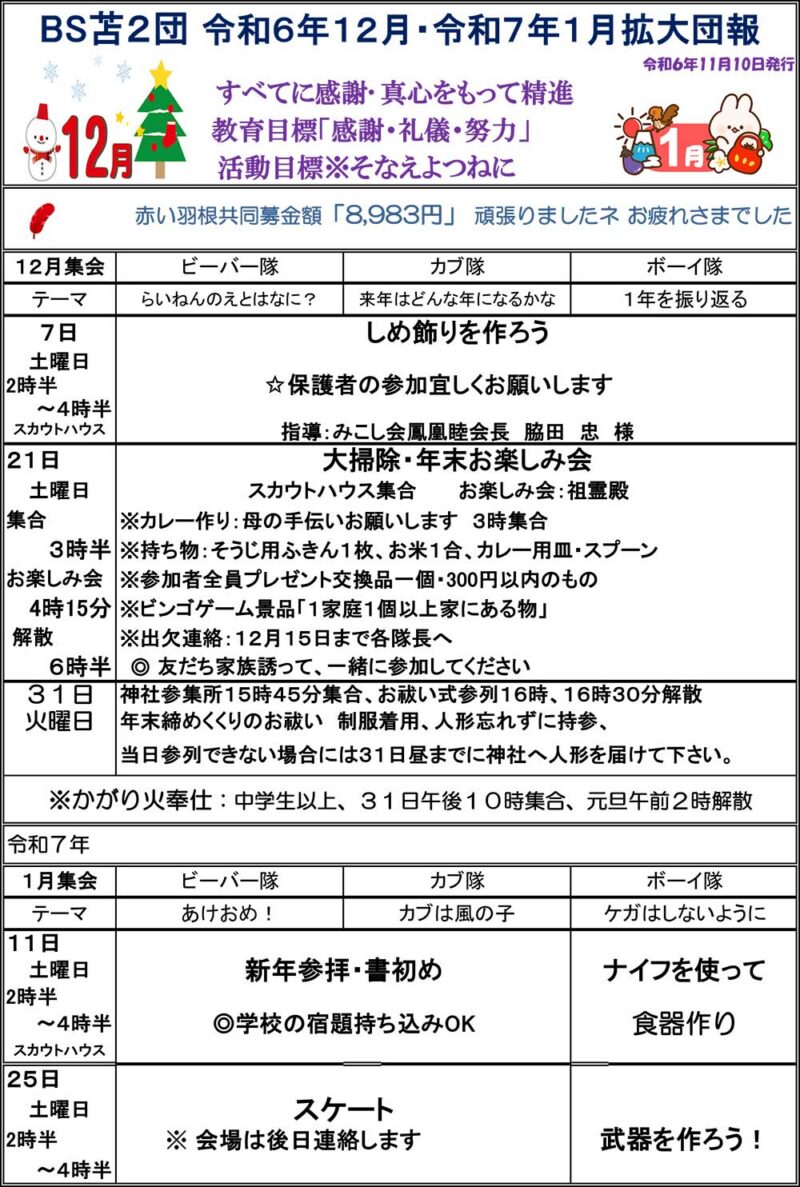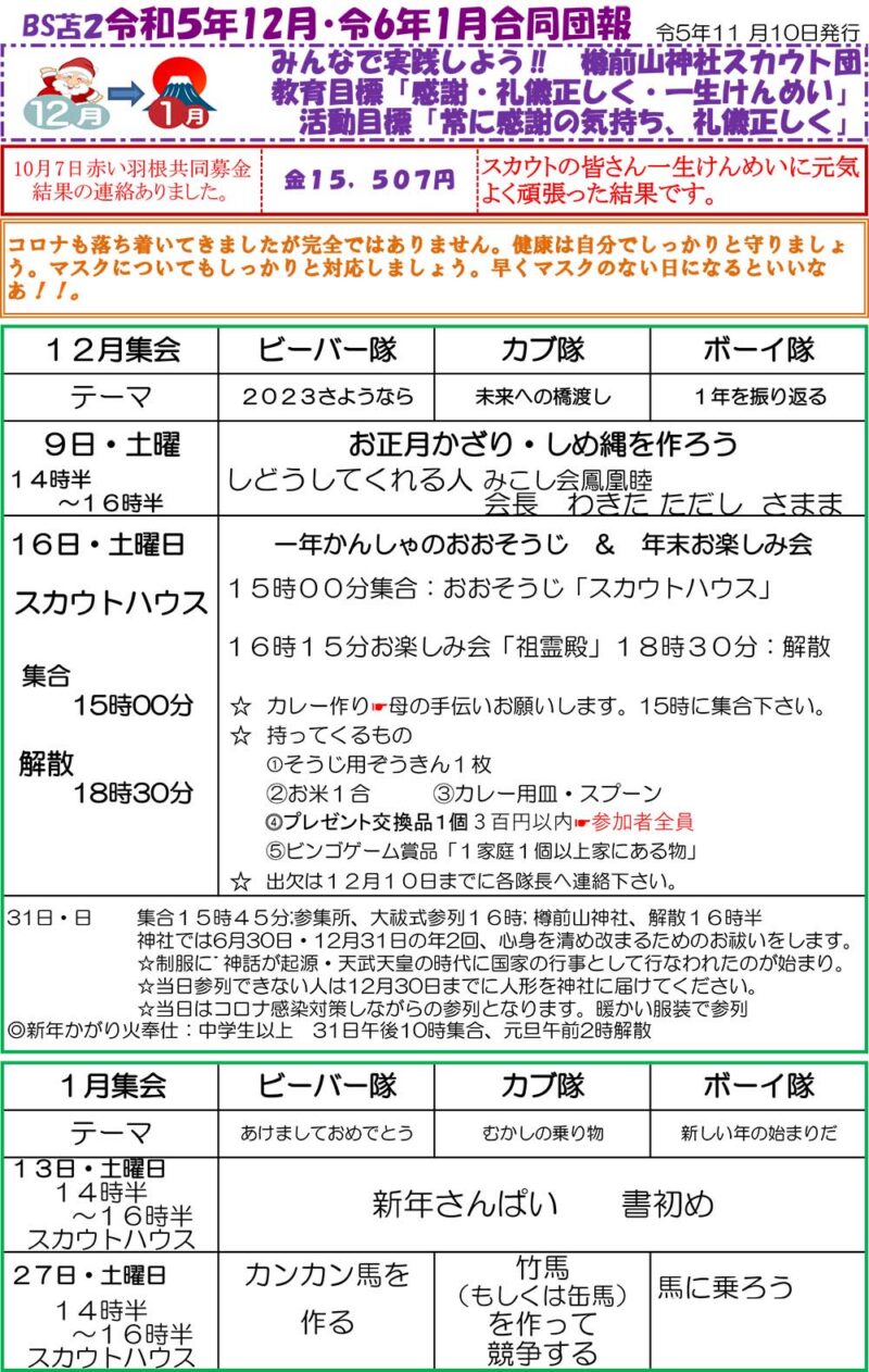 年間の団報の掲載です。一年を通じて楽しい集会が組まれています。12月と翌1月号が合併号となり、年11回の団報が発行されています。