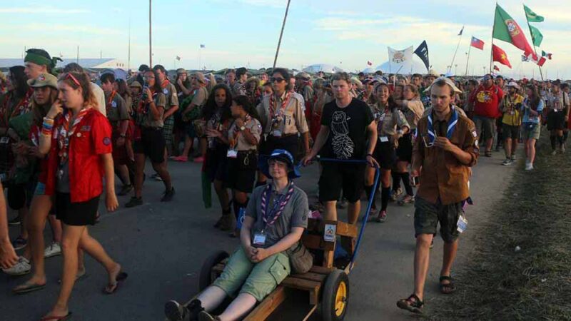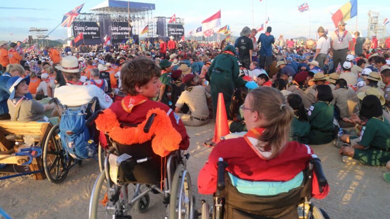 また、参加するスカウト同士には国籍や人種、地域の違いは全く感じられませんでした。身体的なハンディキャップを持つスカウトも多く参加しており、それを補うための工夫が随所に見られました。例えば、大きなリヤカーや改造された車いすを利用し、それらを補助するスカウトたちはハンディキャップを意識することなく自然に支え合っていました。こうした姿勢は非常に感動的で、まさにスカウトの精神が根付いていることを感じさせます。