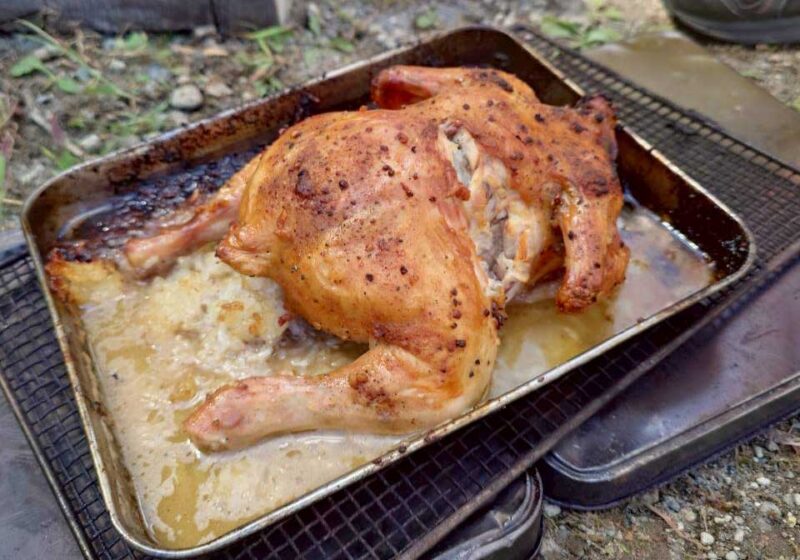 一方、ボーイ隊のスカウトたちは特別な挑戦をしていました。ブロックと一斗缶を使って、即席のオーブンを自作し、丸どり2羽をハーブとニンニクで味付けしてじっくりと焼き上げるのです。炭の火加減を調整しながら、時間をかけて香ばしく焼きあがる丸どり。表面はパリッと、中はジューシーに仕上がり、料理が完成したときには思わず歓声が上がりました。自分たちの手で作った料理をみんなで分け合いながら食べる味は格別で、スカウトたちは満足げな笑顔を見せていました。