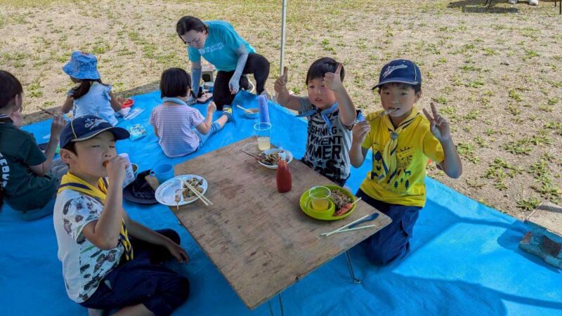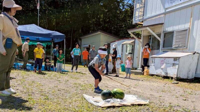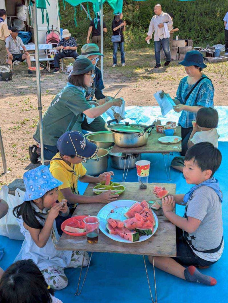 昼食のあとは、お楽しみイベントとして恒例の「スイカ割り」が行われました。2個のスイカを用意し、小さなスカウトから順番に挑戦。目隠しをして棒を持ち、周りの仲間たちの「右!もう少し左!」という声援を頼りに一打を振り下ろします。見事にスイカが割れると、大歓声と拍手が響き渡りました。割れたスイカは全員で分け合い、夏ならではの甘い味を楽しみました。
